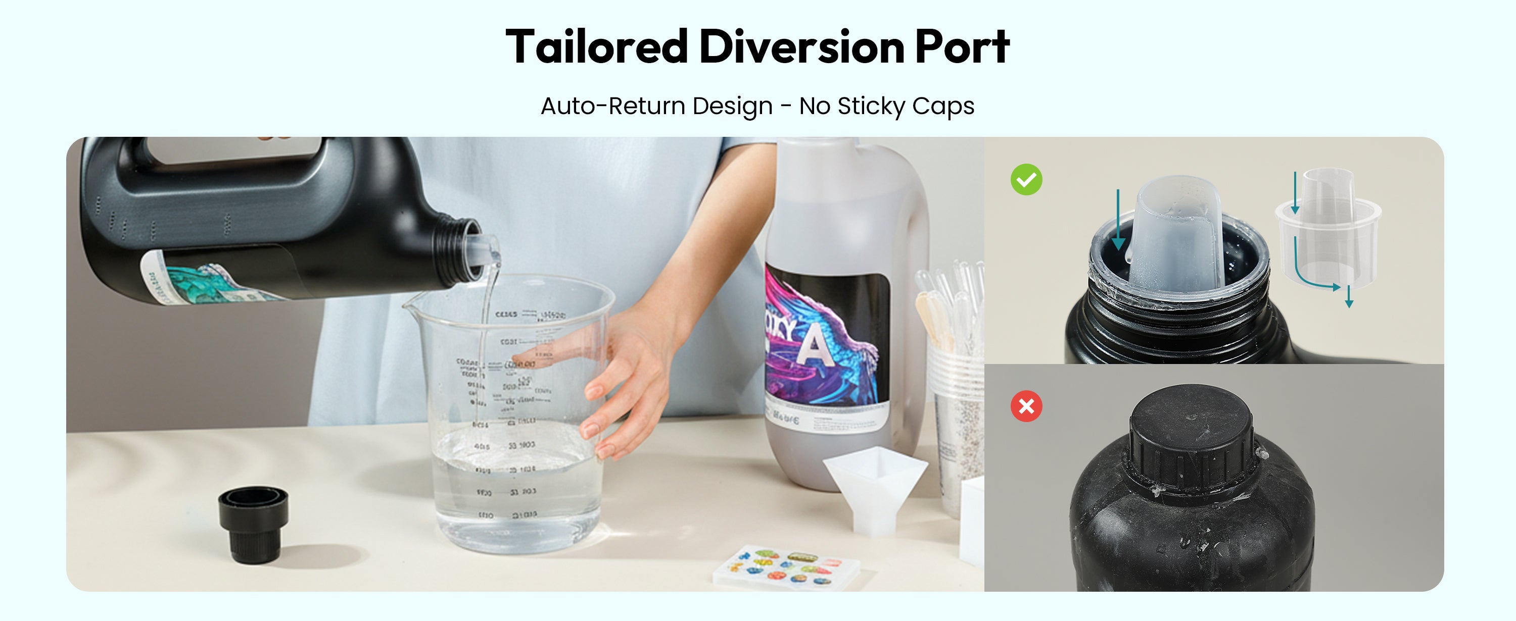- Clean Auto-Return Cap - Our exclusive auto-return spout design prevents sticky messes and wasted resin. Any extra resin flows back into the bottle, keeping the cap clean and preventing hardened buildup. Your resin stays fresh, pours smoothly, and is always ready for your next project.