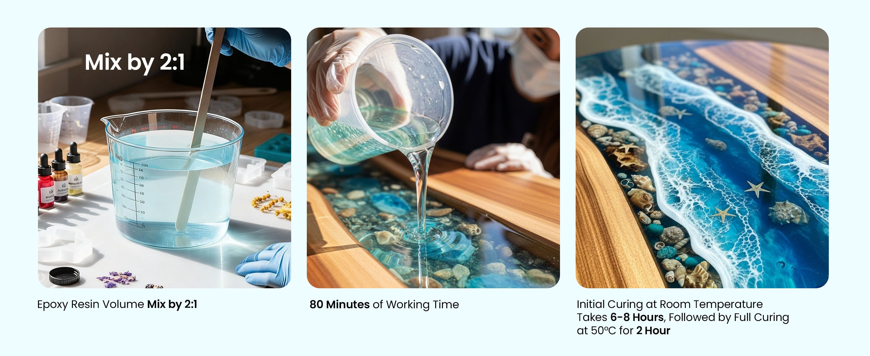 - 80-Min Work Time, 48–72h Cure - Designed for both beginners and experienced makers, this resin offers up to 80 minutes of workable time, allowing detailed adjustments without stress. It cures in 48–72 hours into a tough, crystal-clear, crack-resistant solid. Easy 2A:1B volume mix ratio ensures consistent results every time.