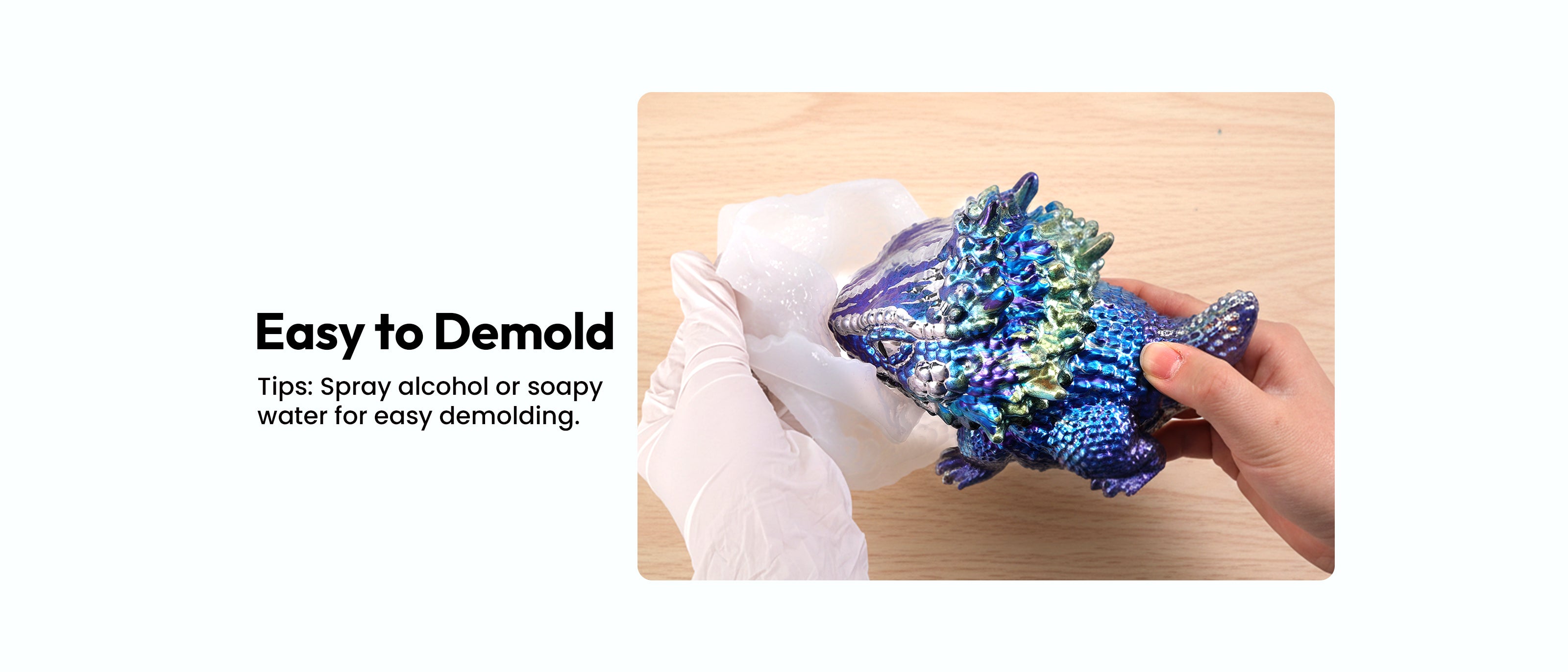 - Tips for Use - ① Use a stirring stick to aid resin pouring. After covering the silicone molds for resin with resin, gently press the mold’s edges to eliminate air bubbles. ② Alternatively, use a stick or resin bubble remover—never apply a lighter/heat gun directly to the silicone mold (may cause damage). ③ Demolding: Epoxy resin shrinks slightly after curing, which can leave sharp edges. Follow the included manual’s safe demolding method—start at edges, peel gently (avoid excess force). For easier release, use alcohol or water as a lubricant.